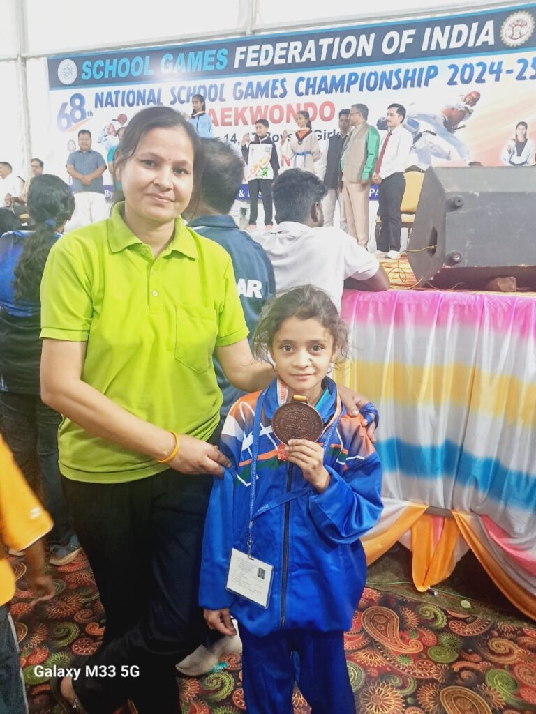 68वीं 14 व 17 बालक-बालिका राष्ट्रीय ताइक्वांडो प्रतियोगिता जो दिनांक 8 नवंबर 2024 से 12 नवंबर 2024 तक विदिशा मध्य प्रदेश प्रदेश में आयोजित हो रही है जिसमें पीएम श्री अटल उत्कृष्ट राम रतन लाल भगवत सरन राजकीय बालिका इंटर कॉलेज टनकपुर चंपावत (टीम उत्तराखंड) की कक्षा 6 की छात्रा कुमारी डॉली ने खेल शिक्षिका श्रीमती ममता बिष्ट के निर्देशन में 18-20 किलोग्राम भार वर्ग में ब्रॉन्ज मेडल मेडल प्राप्त किया